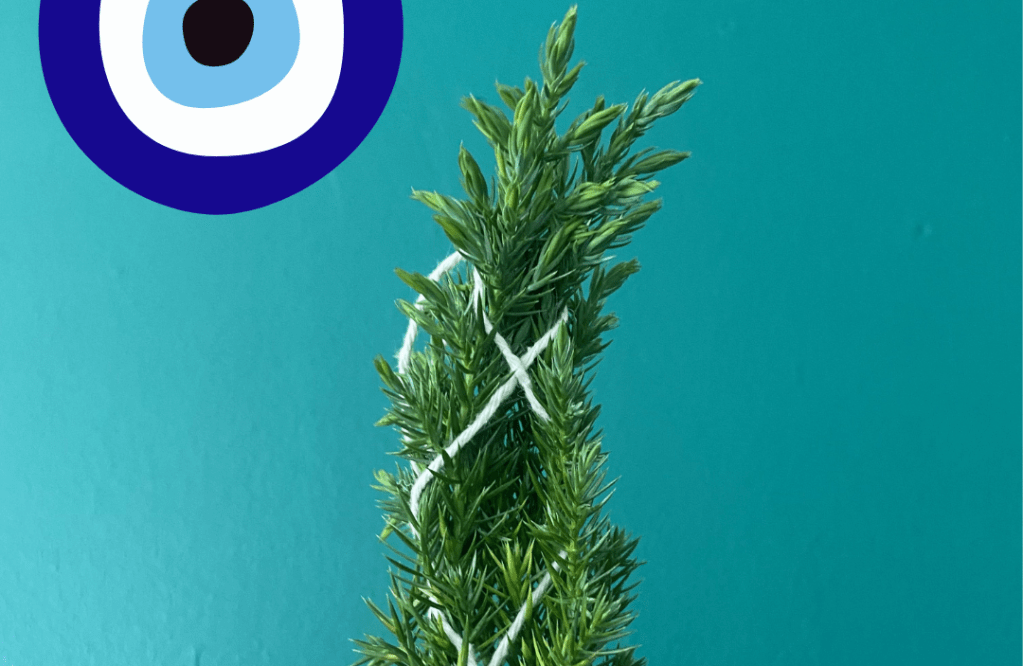 Firstly, you will gather Juniper, Rowan, or Pine (all traditional Saining plants) without the use of any metals while reciting the Ave Maria in Latin (or in Scottish Gaelic, Failte, a Mhoire). You can bundle the herb like I have or use just one sprig. Let it dry.